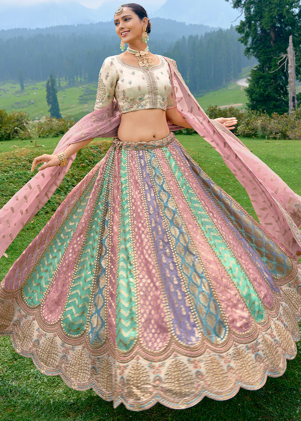 Shades Of Green Banarasi Jacquard Silk Lehenga with Cut Work & Hand Work Embroidery | Ready To Wear