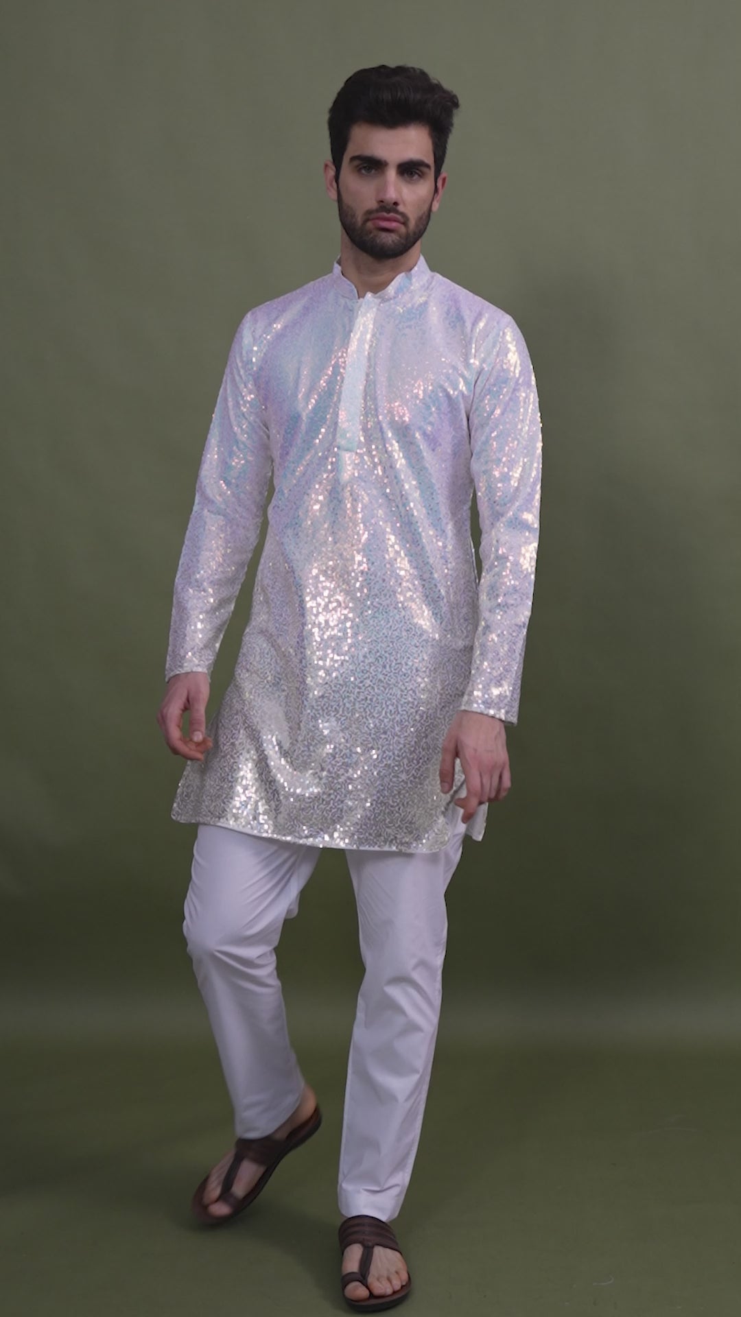 WHITE PURE VISCOSE RAYON THREAD, SEQUENCE & FOIL MIRROR EMBROIDERED WORK KURTA