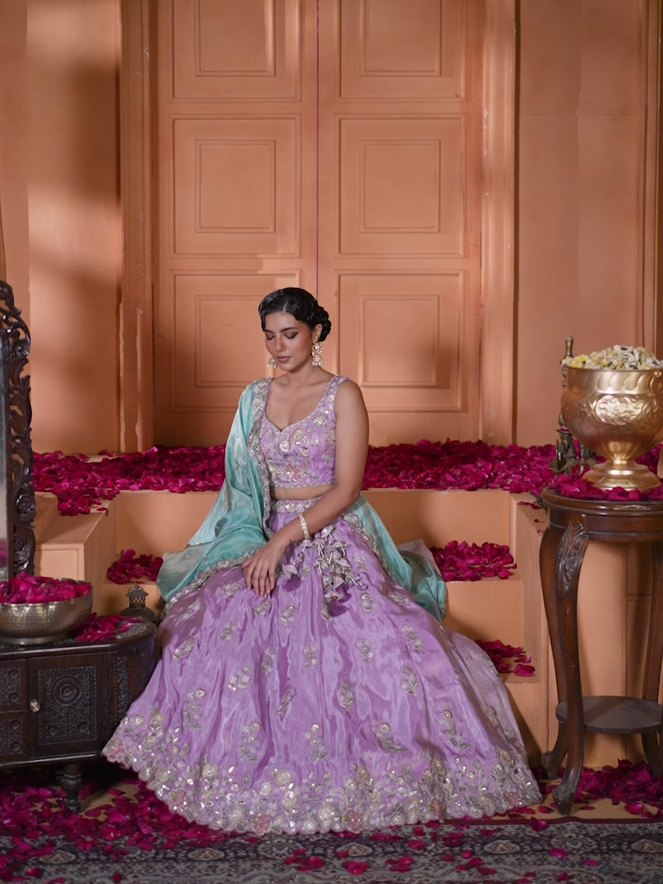 Lavender- Satin Silk Fabric Sequins embroidery Semi-Stitched Lehenga & Unstitched Blouse With Dupatta