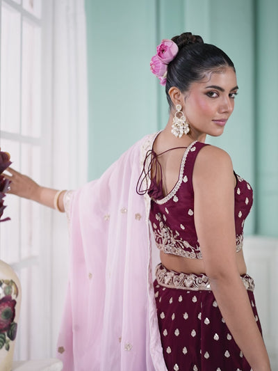 Maroon- Organza Fabric Sequins embroidery Semi-Stitched Lehenga & Unstitched Blouse With Dupatta