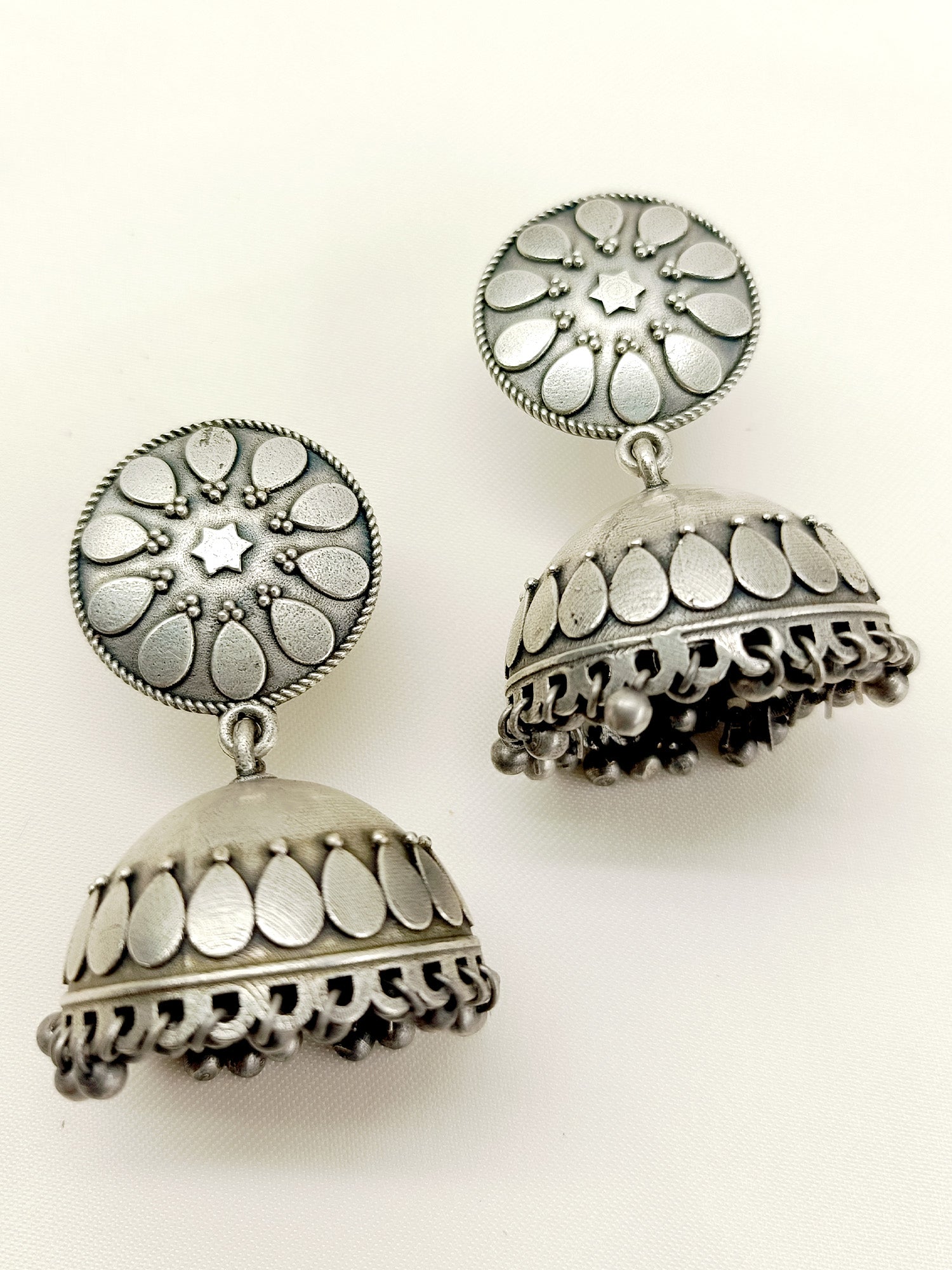 Introducing Oxidized Jhumki. Made With Oxidized Silver Plated Brass Metal, Elevate Your Style With These Unique And Beautifully Crafted Earrings That Add A Touch Of Elegance To Any Outfit. Perfect For Any Occasion. Order Yours Now.