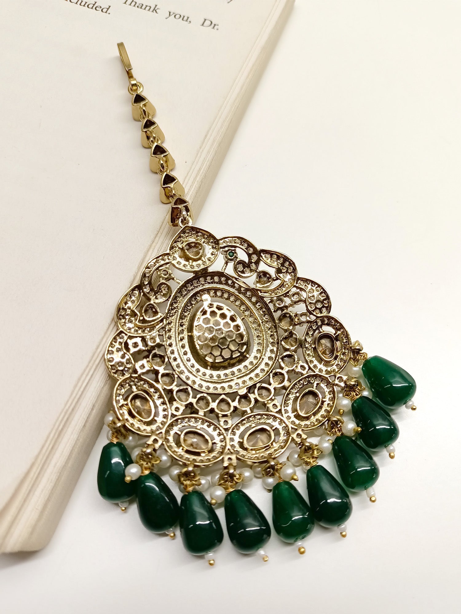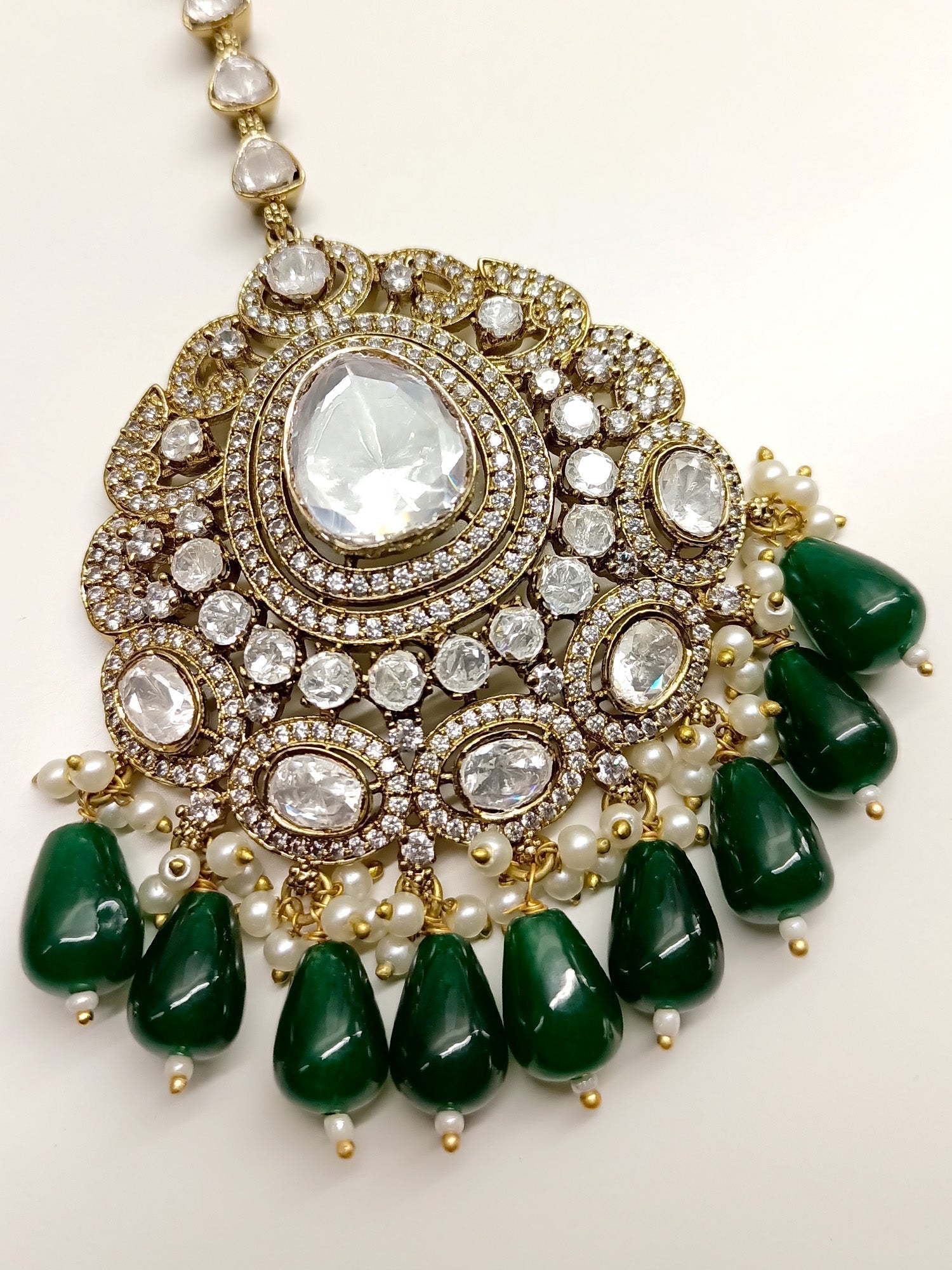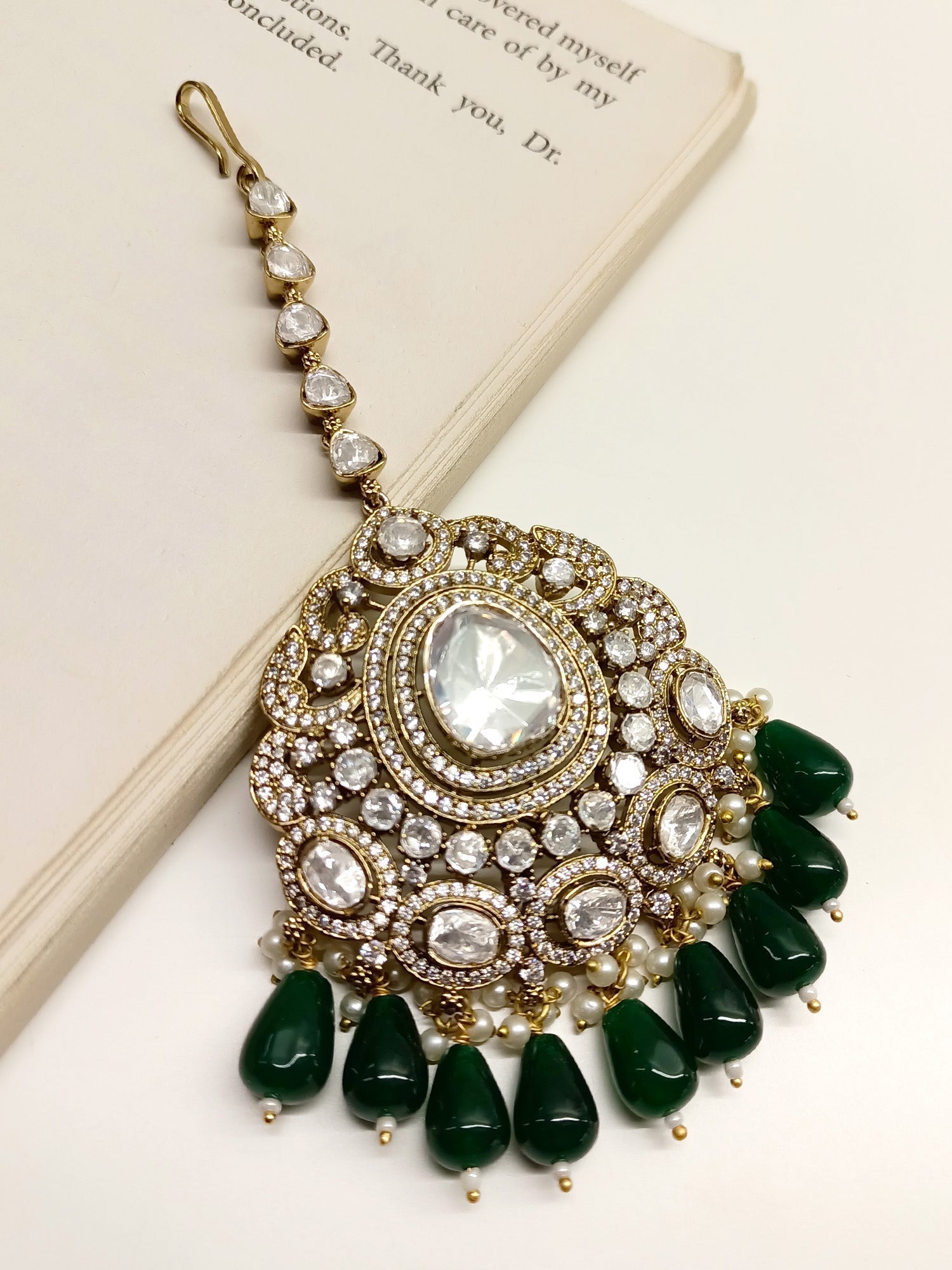 This Victorian Maangtikka Is A Traditional Piece Crafted With Precision. Its American Diamond Setting And Antique Gold Plated Brass Metal Make It A Timeless Addition To Any Jewelry Collection.