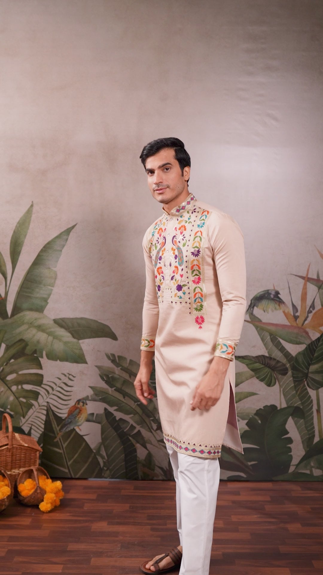 Beige Multi Thread And Sequins Embroidery Work Festive Wear Kurta Set - qivii