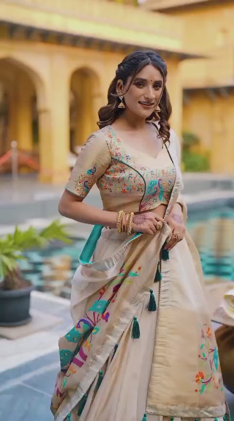 Beige-Teal Shimmer Paithani Lehenga Choli