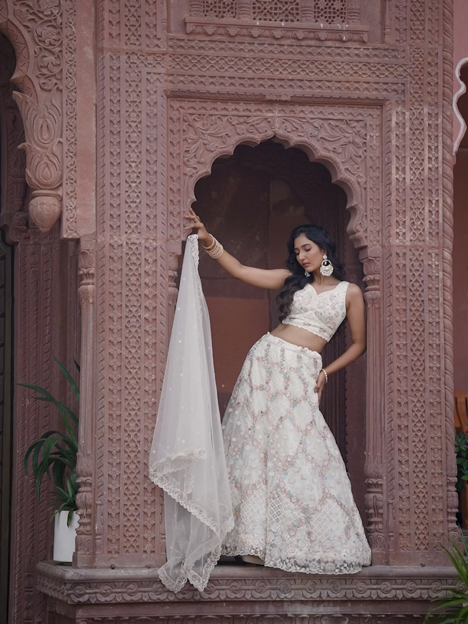 • Lehenga:- Made of premium quality Net fabric Full Flaire Semi-Stitched Lehenga With Sequins and stone and Coding work has a thread Embroidery work. Has a thread cutwork border on the hemline.