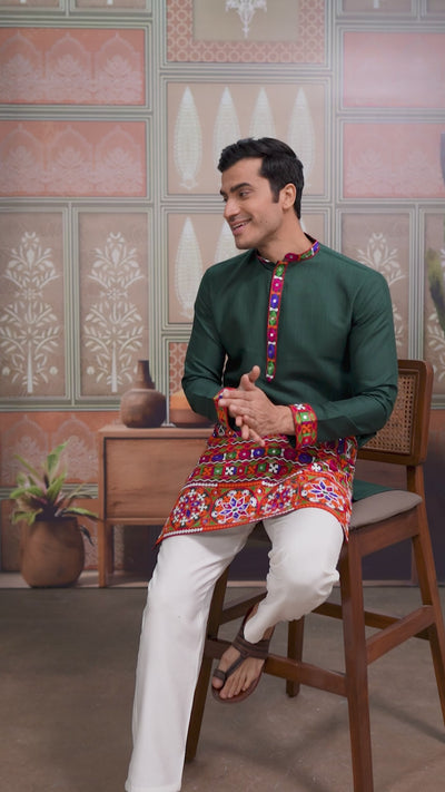 Green Multi Thread And Real Mirror Work Kurta Set For Navratri - qivii