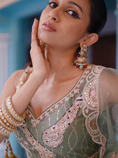 GREEN - Net Fabric Sequins embroidery Semi-Stitched Lehenga & Unstitched Blouse With Dupatta
