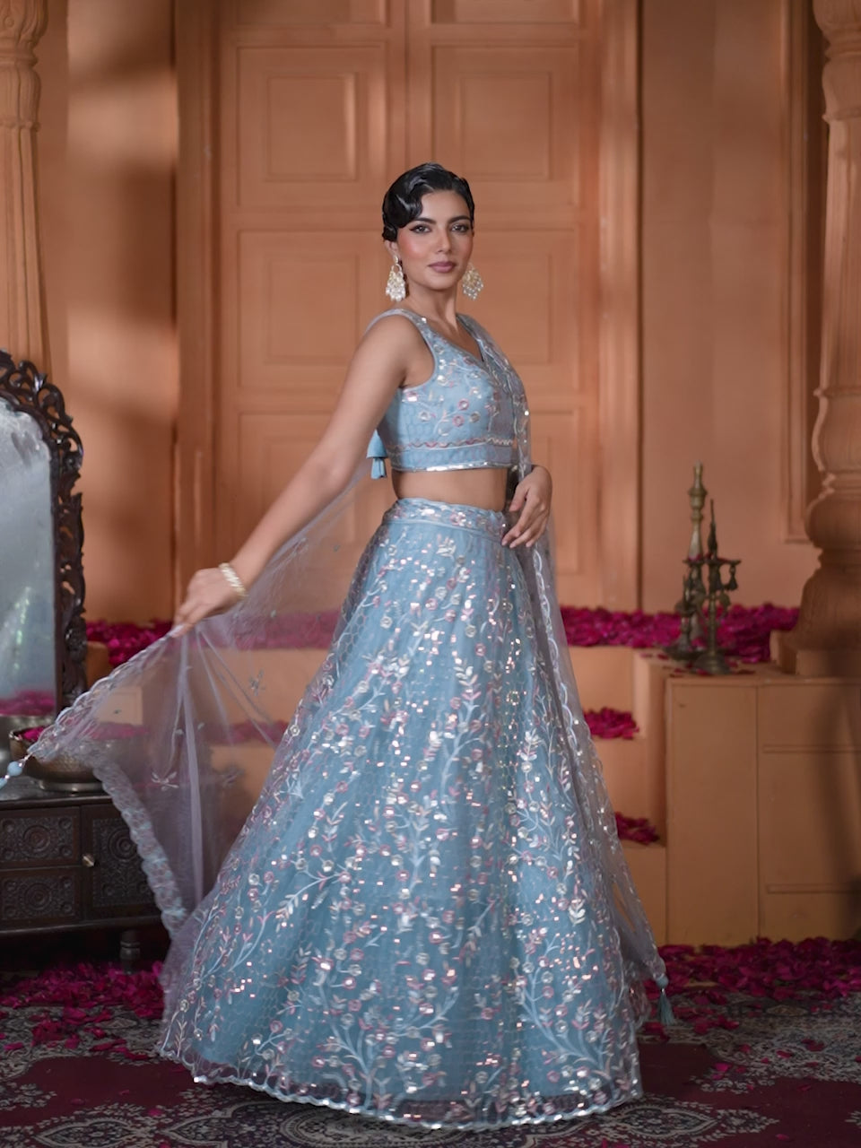 Grey- Net Fabric Sequins embroidery Semi-Stitched Lehenga & Unstitched Blouse With Dupatta