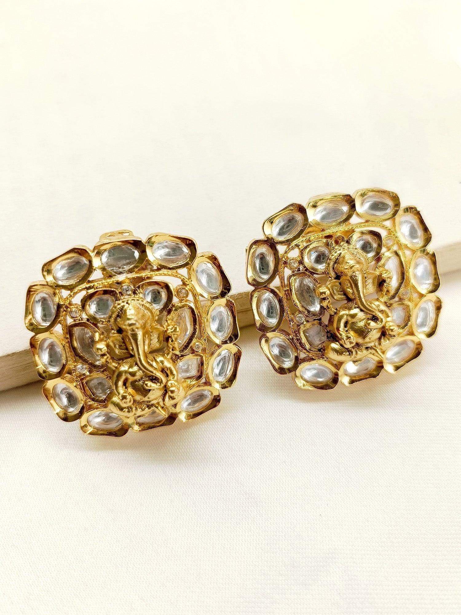 Embrace the rich heritage of India with the Kamari White Ganesh Ji Kundan Tops. These exquisite earrings bring together tradition and elegance, beautifully handcrafted with detailed Ganesh Ji motifs that resonate with cultural significance. The gold-plated brass metal adds a touch of sophistication, making these earrings a perfect addition to any wardrobe.