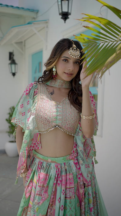 Light Green Digital Print And Embroidery Work Lehenga With Stylish Blouse