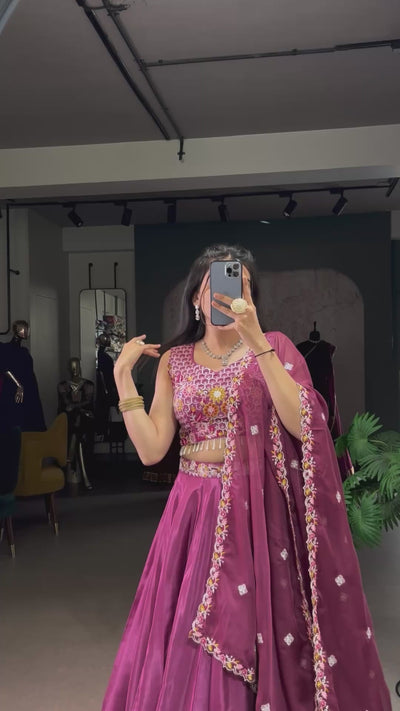 Magenta pink lehenga set in rich silk crepe, adorned with thread and sequins embroidery waist belt. The blouse features elegant lace touch-up, paired with organza dupatta showcasing graceful finish.