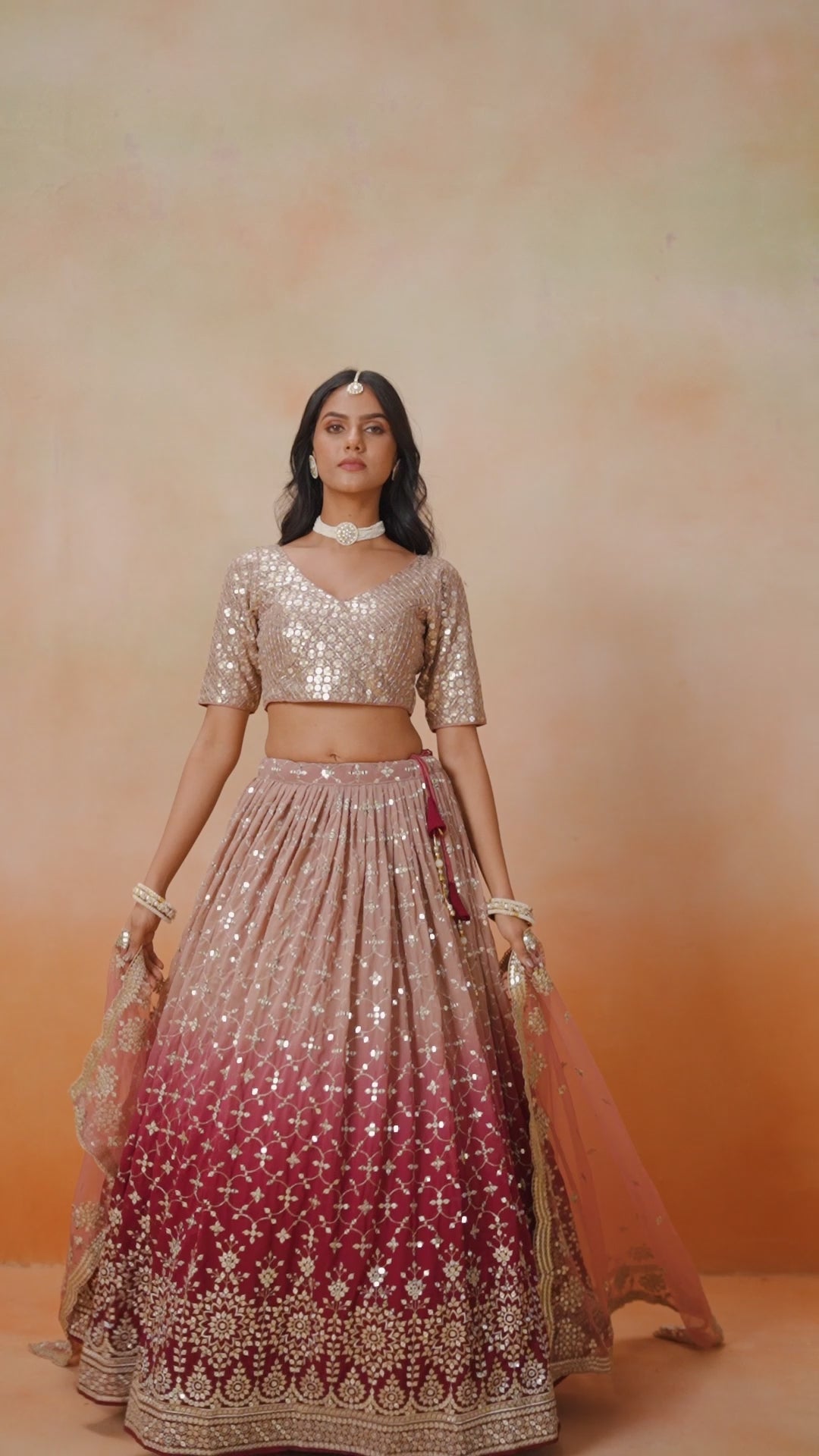 This Georgette Ombre lehenga features a soft mauve-to-maroon gradient, beautifully adorned with silver sequins and delicate zari embroidery. It comes with a matching embellished choli and a light net dupatta. It's perfect for weddings, parties, and festive occasions.