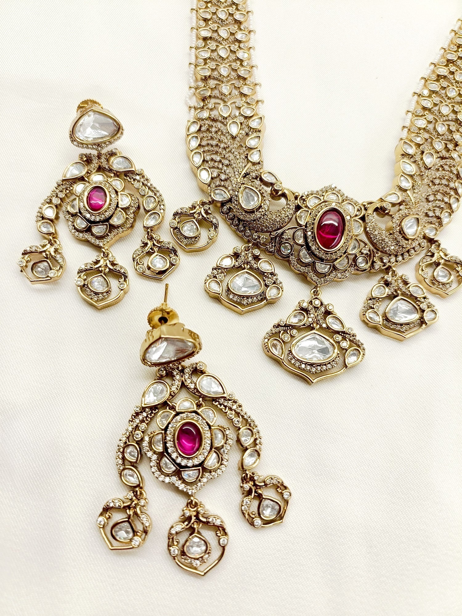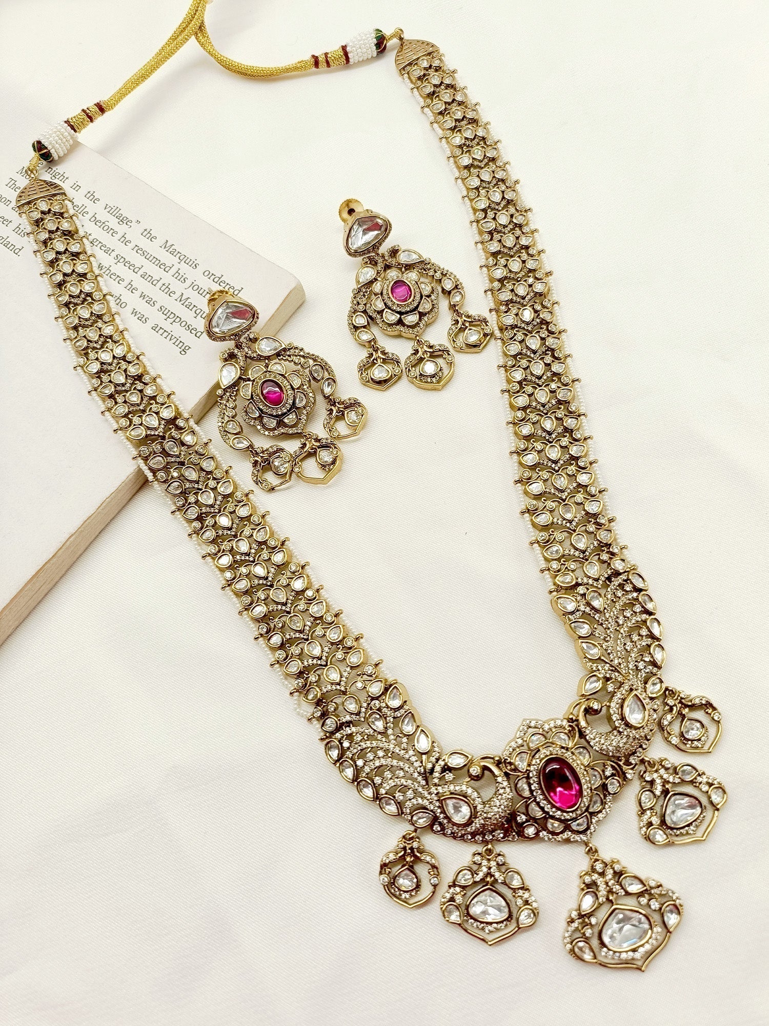 This Maroon Long Polki Set Is A Stunning Piece Of Traditional Jewelry. Crafted With Antique Gold Plated Brass Metal And A Unique American Diamond Setting, It Exudes Elegance And Sophistication. Its Design And Craftsmanship Make It A Must-have For Any Occasion.
