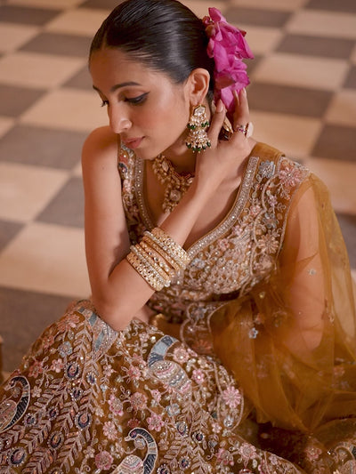 MUSTARD - Net Fabric Sequins embroidery Semi-Stitched Lehenga & Unstitched Blouse With Dupatta