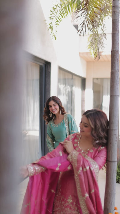 Introducing our new sharara suit collection in luxurious in fendi silk, detailed with sequins zari embroidery. Paired with a matching sharara and dupatta, complete graceful look. it’s perfect for parties, festivals, and traditional ceremonies.