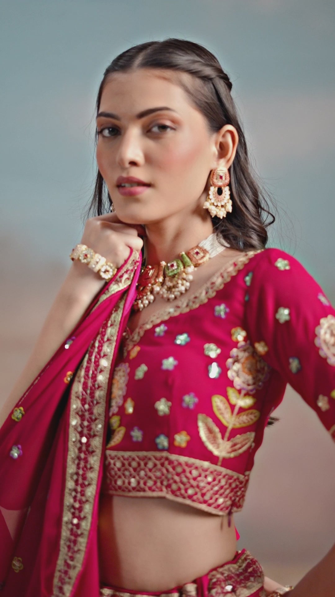 This lovable Pink georgette lehenga choli features exquisite sequins and thread embroidery, offering a chic monochrome design perfect for parties and festive occasions, this lehenga is designed to make you shine with every step.
