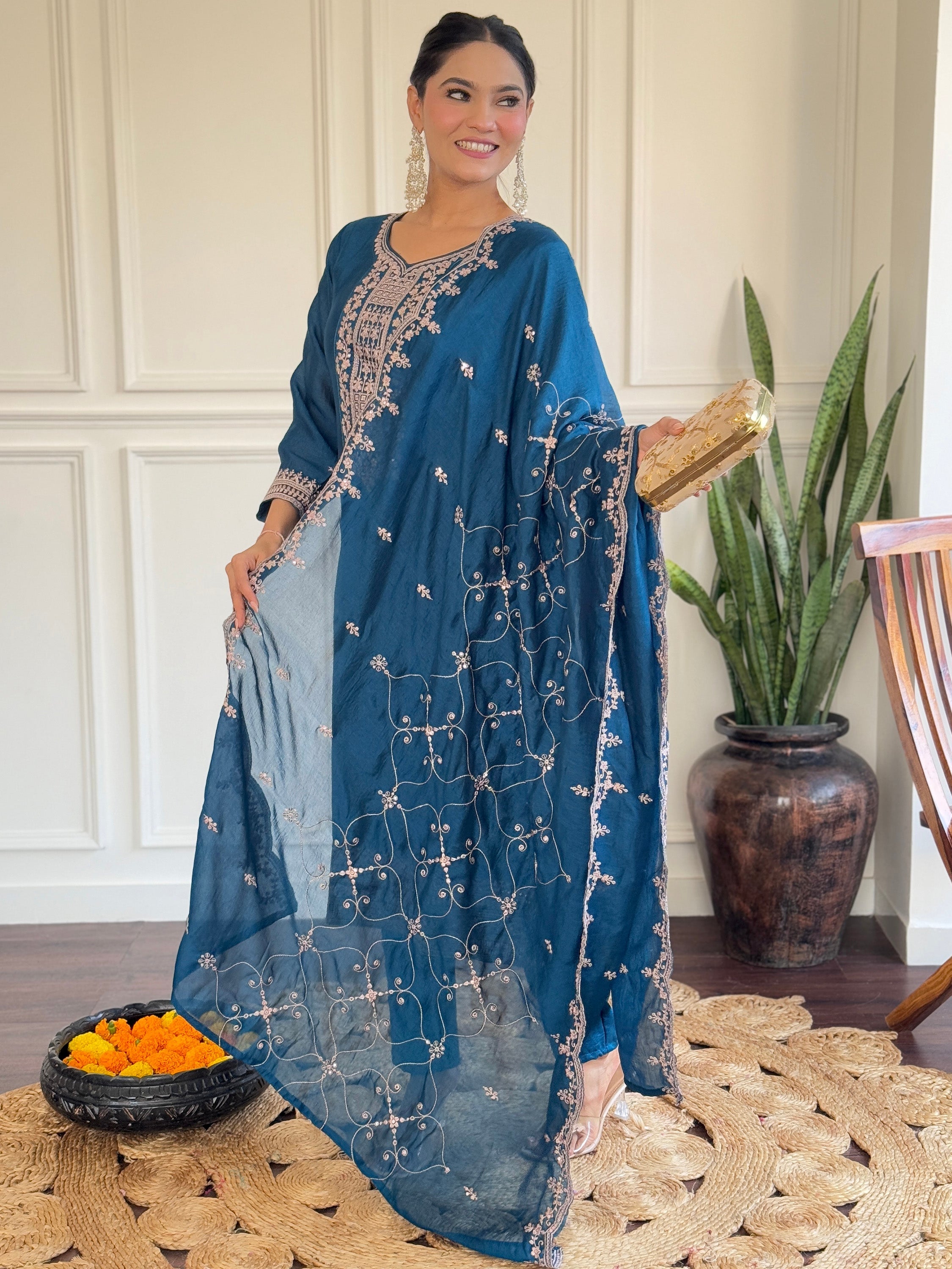 - This blue Vichitra silk suit is adorned with intricate zari and thread embroidery, complemented by shimmering sequin work for a touch of glamour.