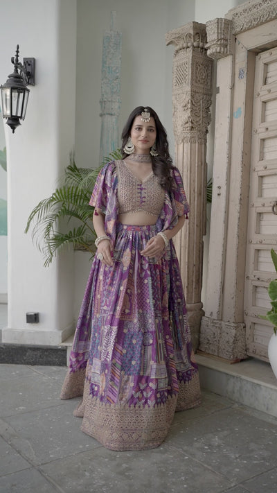 We’re introducing a stylish purple chinnon silk lehenga with multicolored prints with zari and dori embroidery work. The embroidered blouse with a pearl-trimmed scalloped hem pairs with choker style dupatta. Perfect for weddings, parties, and festive celebrations.
