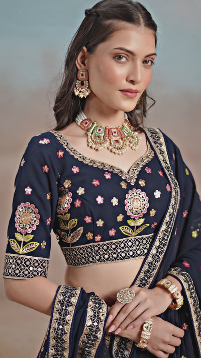 Turn heads in this captivating Purple georgette lehenga choli, beautifully designed with sequins and thread embroidery. The monochrome look adds elegance, perfect for parties and festive occasions, this lehenga is designed to make you shine with every step.