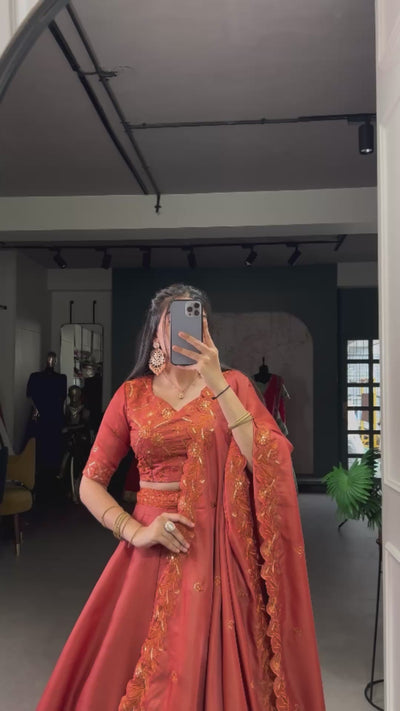 Rust Orange Tussar Silk Thread & Sequins Embroidery Work Lehenga Choli