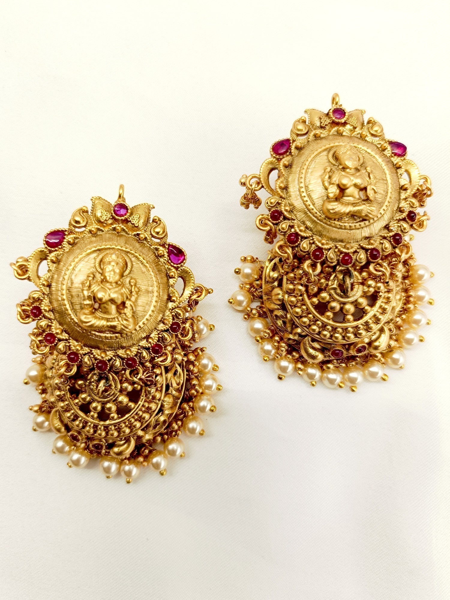 Transform your style and embrace the power of tradition with the Simrat Ruby Temple Antique Jhumki. Let these earrings be a reflection of your inner strength and elegance, making every moment memorable and special.