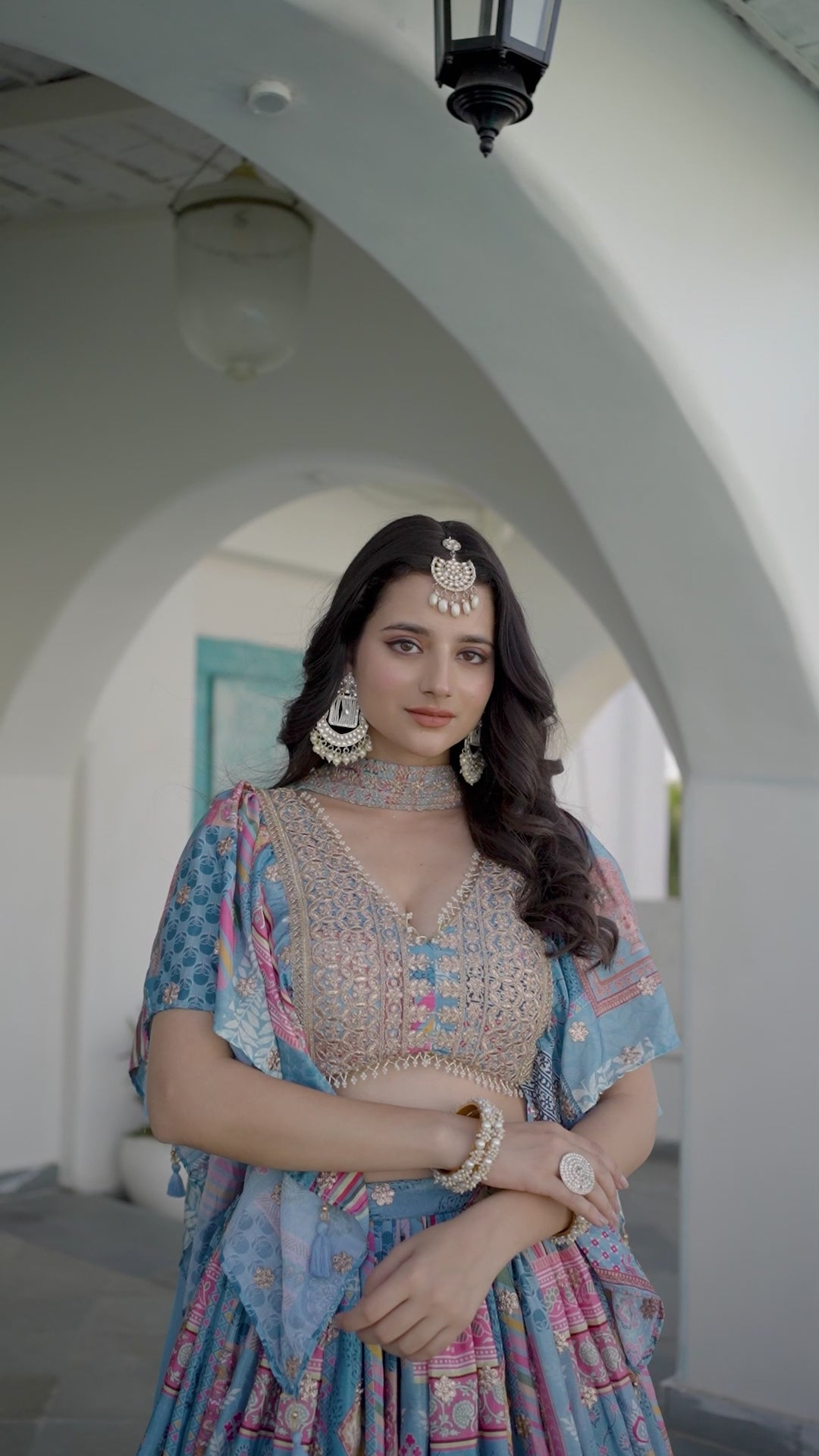 We’re introducing a stylish sky chinnon silk lehenga with multicolored prints with zari and dori embroidery work. The embroidered blouse with a pearl-trimmed scalloped hem pairs with choker style dupatta. Perfect for weddings, parties, and festive celebrations.