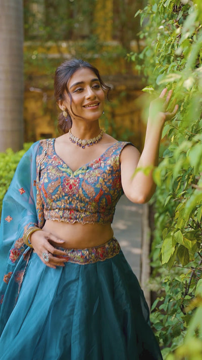 Teal Blue Chanda Silk Embroidery Lehenga Choli