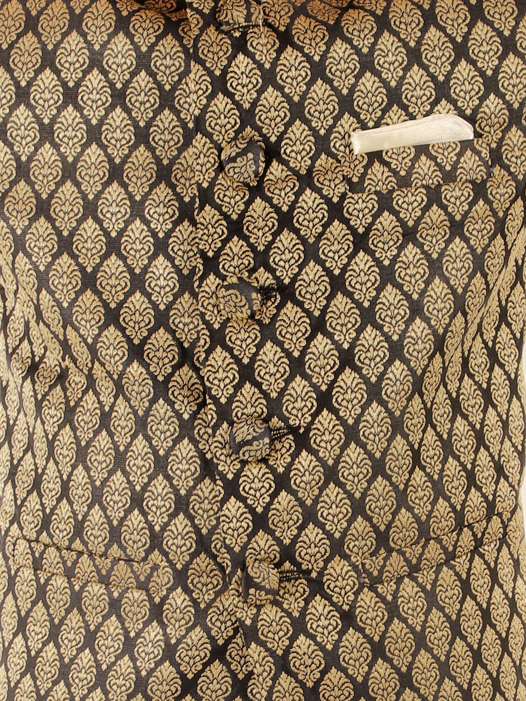 Black color woven design silk blend regular-fit jodhpuri, has a mandarin collar, long sleeves, a full button placket, one welt pocket, straight hem. Comes with pocket square