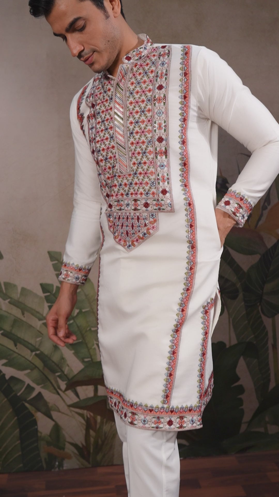 White Festive Wear Kurta Set With Multi Thread Sequins Embroidery Work - qivii